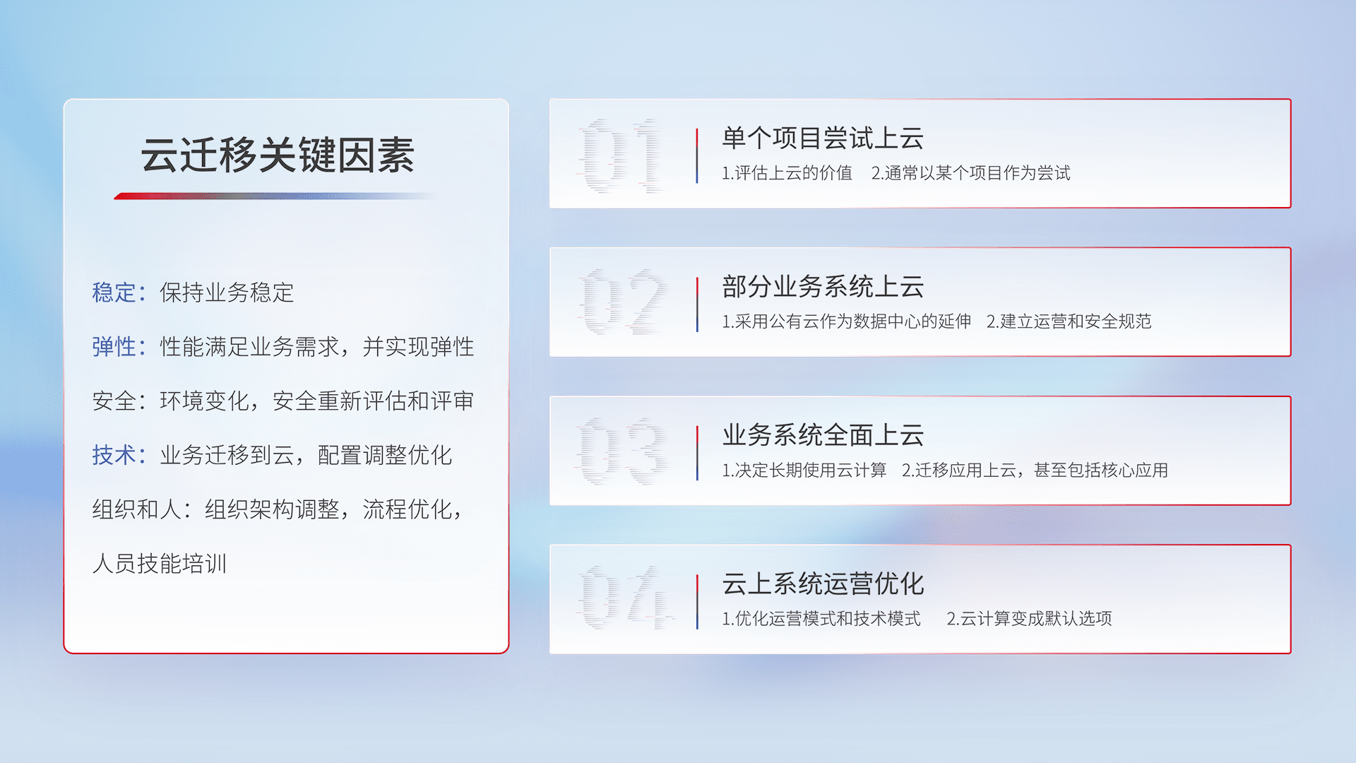 结合实际业务,,,从规划设计、、、、云平台选型、、、、云原生改造、、数据迁移、、、集成交付,,迁移全过程为客户识别最佳上云路径,,做好风险识别管理,,,设计网络架构、、、、身份权限、、、、安全审计合规、、操作审计、、日志审计、、、、监控告警策略、、多站点容灾设计等,,对云上基础设施进行整体规划,,,提升IT治理水平,,,以满足弹性、、、、高可用、、、、高性能的需求。。。。