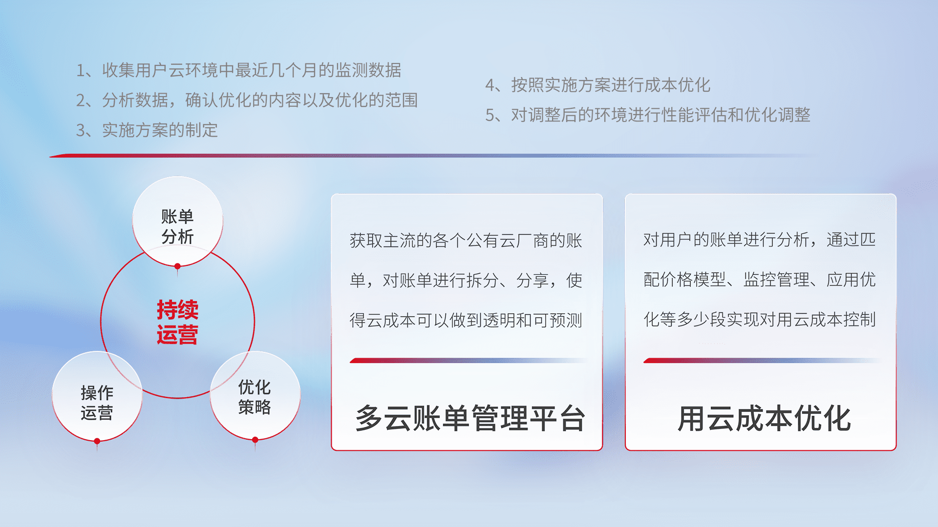 通过多云纳管,,以统一的资源数据模型把客户的云资源进行抽象和封装,,进而实现对多云资源的统一操作,,,保障云资源管理的可靠性、、、、稳定性与可用性。。。量身定制化运维内容,,,配置、、开发运维、、补丁管理、、、、备份、、、监控、、认证和访问管理、、、审计和日常巡检等,,,,保障在用云过程中的可靠度,,稳定度以及高可用率。。。。
