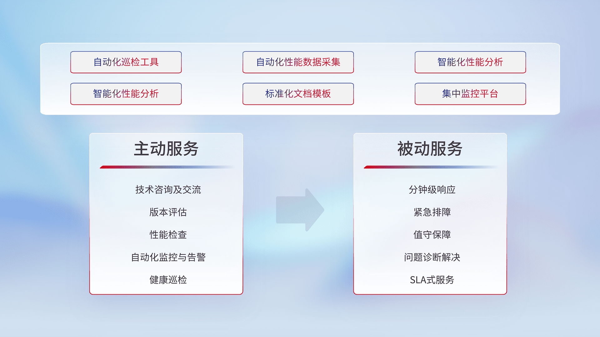 智能化工具和标准化文档,,,保障服务质量,,,提供主动服务(包含技术咨询、、版本评估、、、性能检查、、、、自动化监控与告警、、、健康巡检)和被动服务包含(分钟级响应、、紧急排障、、、值守保障、、问题诊断解决、、SLA服务)。。